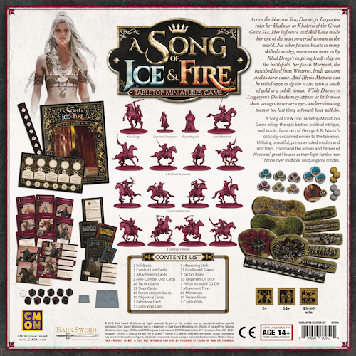 The Targaryen Starter Set for the A Song of Ice and Fire: Tabletop Miniatures Game provides players a new faction to use in the pursuit of the Iron Throne. It comes with everything a player needs to get started right away, including rulebook, dice, measuring sticks, the Targaryen Tactics Deck, tokens, counters, and more. The faction primarily consists of cavalry units, including Dothraki Screamers, Outriders, and Veterans. There are also special characters like Khal Drogo, Daenerys Targaryen, and Jorah Mormont players can use to augment their armies. This highly-mobile, tough force will bring new challenges and new opportunities to the battlefield.