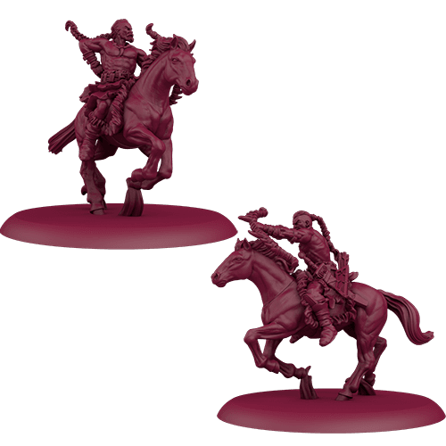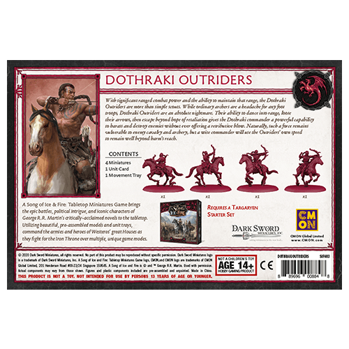 The Dothraki Outriders Unit Box for the A Song of Ice and Fire: Tabletop Miniatures Game gives House Targaryen players a swift ranged force for their army. These lightly armored mounted troops make full use of their horses both before and after raining arrows down on their opponents. With their great speed, the Dothraki Outriders can reach out and deal damage to enemies normally considered safe along the back lines of an army. Enemy commanders will have a difficult time pinning down these highly mobile troops.