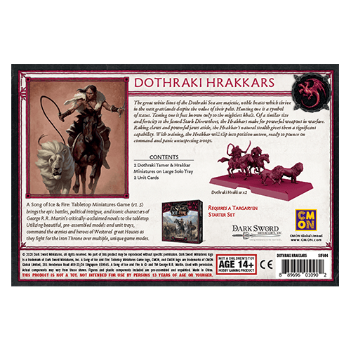 Taming one of the great white lions of the Dothraki Sea is a feat accomplished by only the mightiest khals. The Hrakkars are powerful beasts that match even the famed Stark Direwolves in terms of conferred status, and in war is just as fearsome a sight on the field. Fast, deadly, and above all stealthy, troops facing the Dothraki should beware of sudden attacks from unsuspected quarters by lurking Hrakkars.
