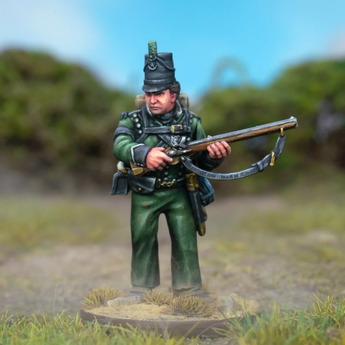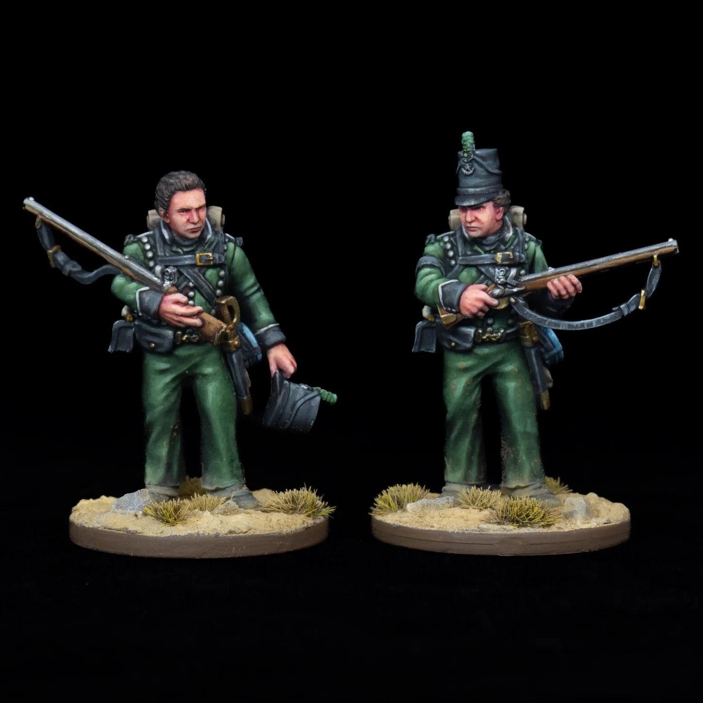 The 54mm model depicts Harper as he defends Blas Vivar’s chest by firing his ramrod into a French cavalryman. The 28mm model depicts Harper with or without his shako on march or ready to fire his rifle.