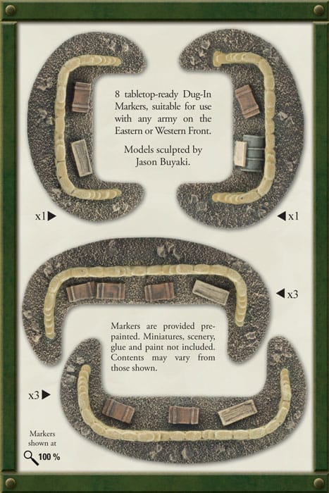 8 tabletop-ready Dug-In Markers, suitable for use with any army on the Eastern or Western Front. Markers are provided prepainted. Miniatures, scenery, glue and paint not included.