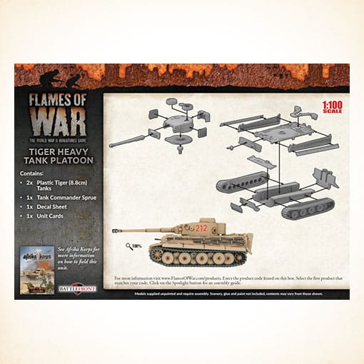 Includes two plastic Tiger (8.8cm) tanks, one Decal sheets and one Unit card.