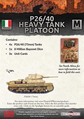 includes four P26/40 (75mm) Tanks, one 8 Million Bayonet dice and three Unit Cards.
