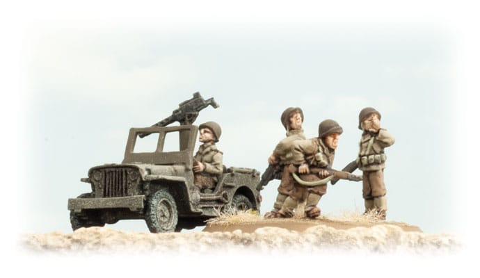 includes two resin and metal Jeeps, two plastic Infantry sprues, one plastic Jeep crew sprue, two small three-hole plastic bases and four Unit cards.